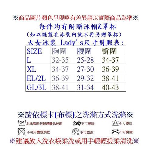 商品規格 內容:連身三角泳裝*1件 尺寸:L/XL/2L/3L 顏色:共同(印花) 材質:尼龍82%、彈性纖維18% 型號:B91612 配件:泳帽x1頂 贈品:無 體驗說明 使用方法說明 大女泳裝 Lady's尺寸對照表: 尺 寸胸圍(英吋)腰圍(英吋)臀圍(英吋) L 32~35 25~28 34~37 XL/LL 34~37 27~30 36~39 EL/2L 36~39 29~32 38~41 GL/3L 38~41 31~34 40~43 注意事項 洗滌方法 請依標卡指示說明清洗 30度水溫洗滌 宜陰乾/不可乾洗/不可漂白/不可烘乾 建議反面放入洗衣袋柔洗或用手輕輕搓揉清洗 商品之樣式及色彩以實物為準 ( 網路上圖片僅供參考 ) 來源:台灣製造 離島可否配送:否